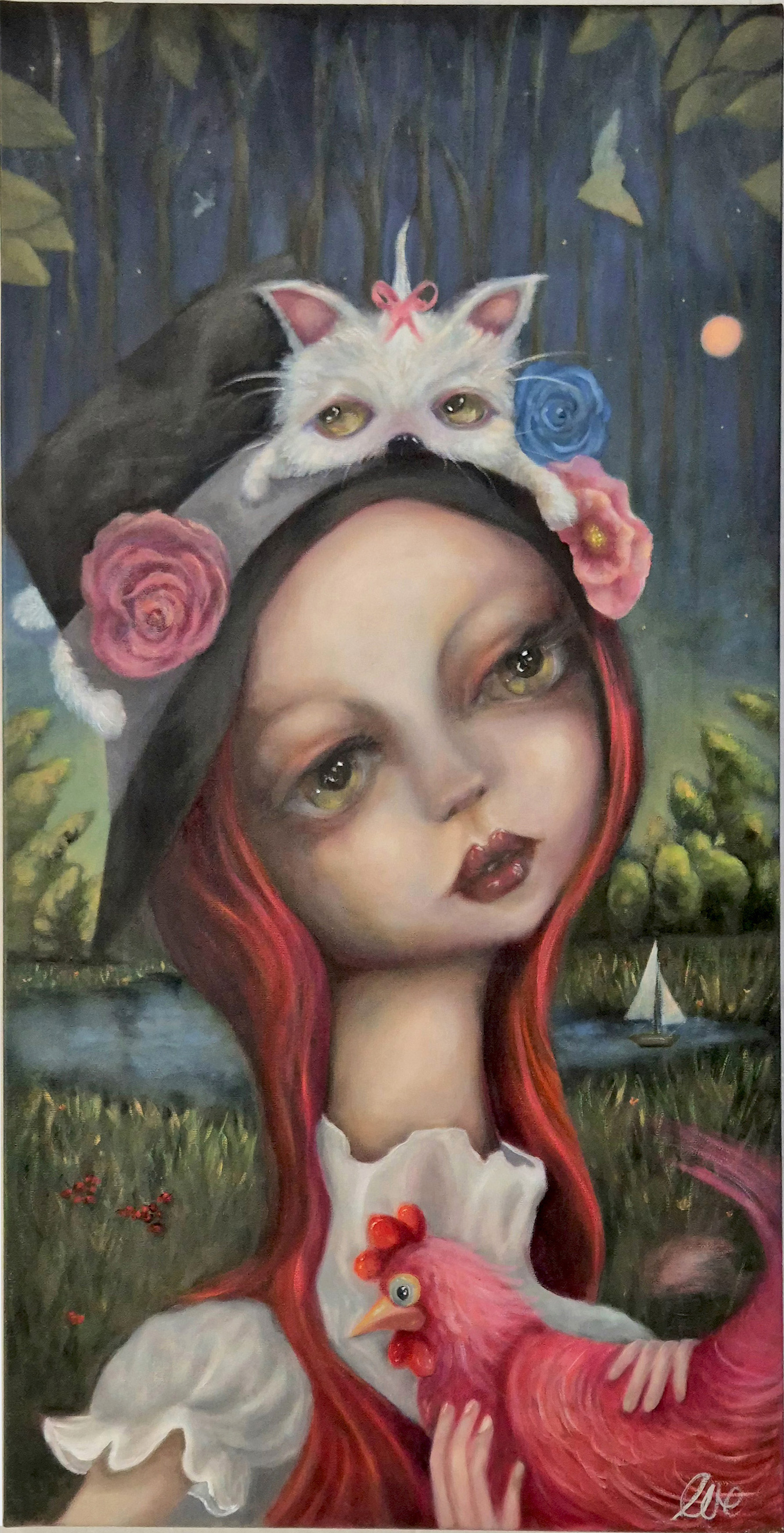 'In their private, lush sanctuary, these three figures represent the multifaceted nature of a single being, savoring life's sweet indulgences with quiet joy. United in solitude, they find fulfillment and completeness within themselves. This painting celebrates femininity and the power of self-companionship. The black bunnies, symbols of humility and mystery, represent a continuous process of renewal.'